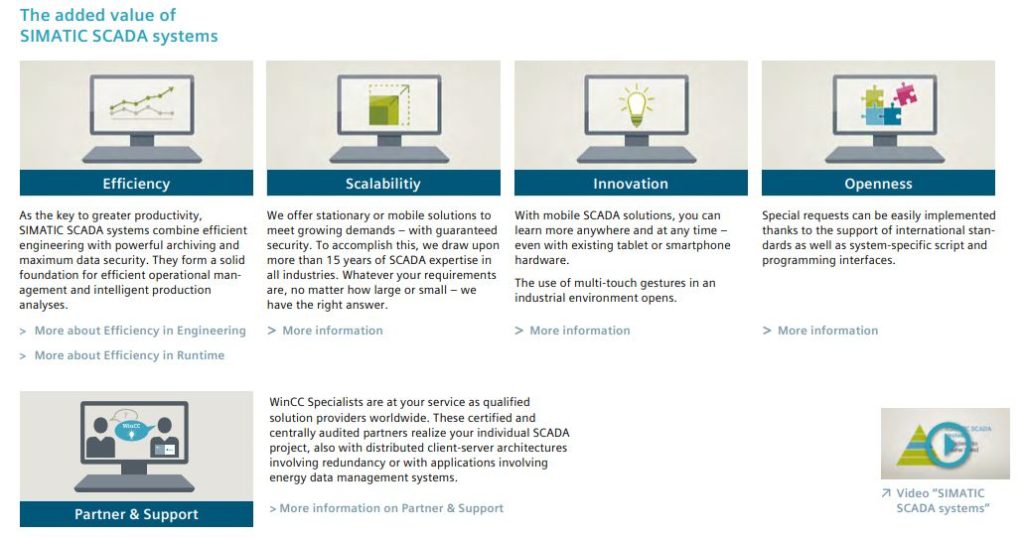 With the SCADA system SIMATIC WinCC V7, Siemens offers an innovative, scalable process-visualization system with numerous high-performance functions for monitoring automated processes. Whether in a single-user system or a distributed multi-user system with redundant servers, the system offers complete functionality for all industries and features optimum openness.